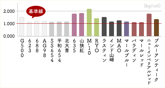 御影石の場合この数値の幅が広いため、「やまきのお墓」で独自に算出した最頻値をもとに1000kg/cm2を基準値として定義し、その数値を上回る石だけを使用しております。